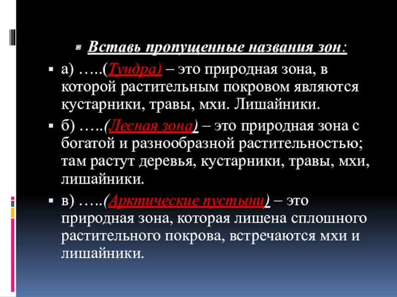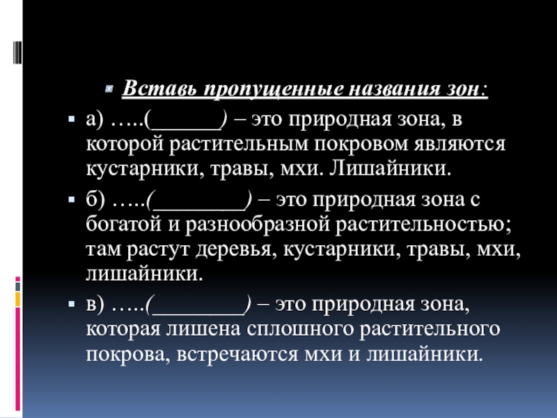 зоне более суровые (______), чем в тундре. Растительный мир беден (____). Большую территорию зоны