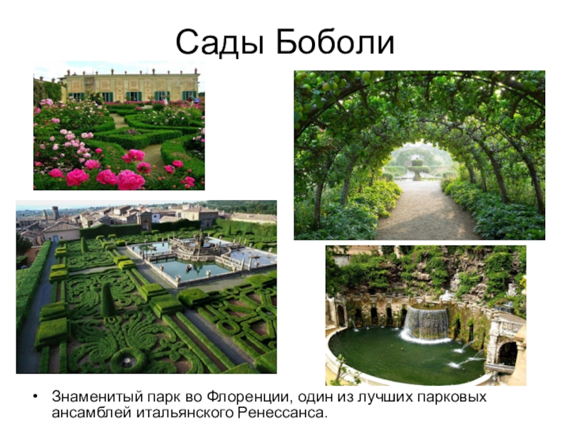 Сады БоболиЗнаменитый парк во Флоренции, один из лучших парковых ансамблей итальянского Ренессанса.