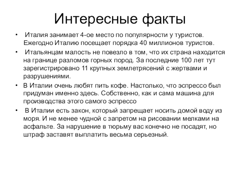 Интересные факты  Италия занимает 4-ое место по популярности у туристов. Ежегодно Италию посещает порядка 40 миллионов туристов.