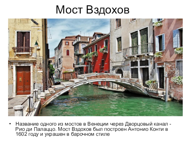 Мост ВздоховНазвание одного из мостов в Венеции через Дворцовый канал - Рио ди Палаццо. Мост Вздохов был