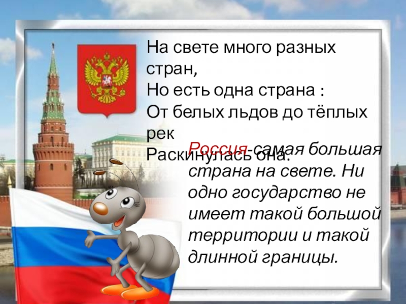 Россия-самая большая страна на свете. Ни одно государство не имеет такой большой территории и такой длинной границы.