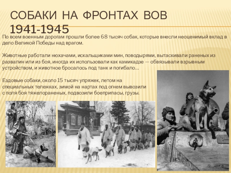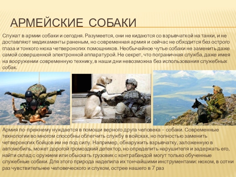 Армия по-прежнему нуждается в помощи верного друга человека – собаки. Современные технологии во многом способны облегчить службу в войсках, но полностью заменить четвероногих бойцов им не под силу. Например, обнаружить взрывчатку, заложенную в автомобиль, может дорогой громоздкий детектор, но определить нарушителя и задержать его, найти склад с оружием или обыскать грузовик с контрабандой могут только обученные служебные собаки. Для этого природа наделила их тончайшими инструментами: нюхом, в сотни раз чувствительнее человеческого и слухом, острее нашего в 7 раз