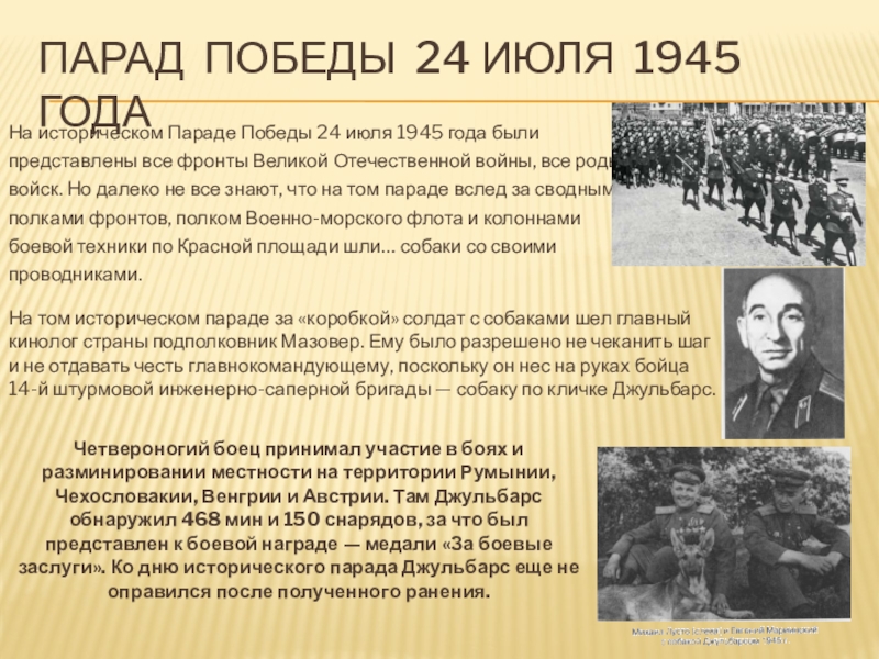 На том историческом параде за «коробкой» солдат с собаками шел главный кинолог страны подполковник Мазовер. Ему было разрешено не чеканить шаг и не отдавать честь главнокомандующему, поскольку он нес на руках бойца 14-й штурмовой инженерно-саперной бригады — собаку по кличке Джульбарс.
