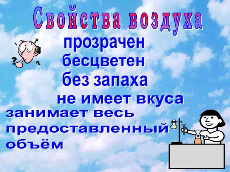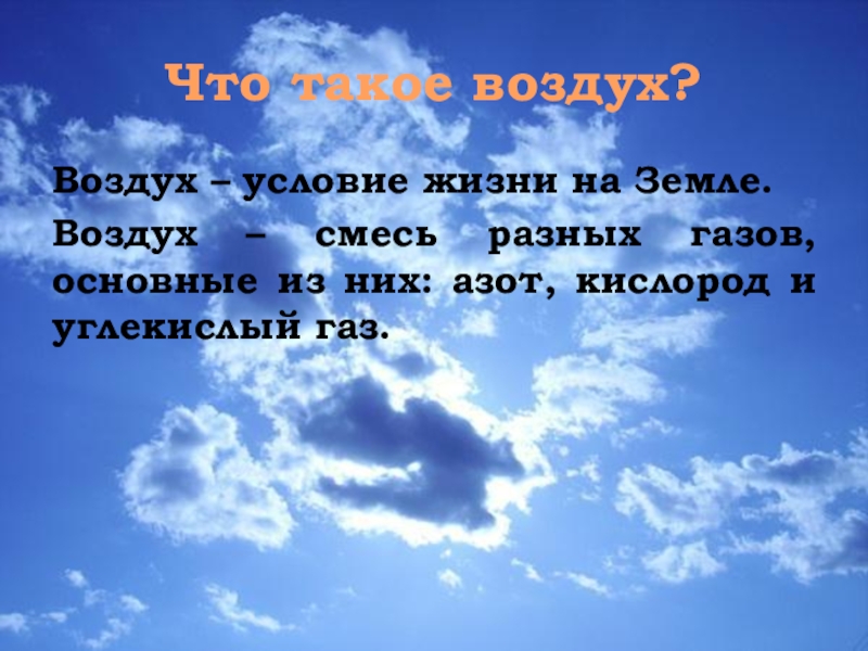 Что такое воздух?Воздух – условие жизни на Земле.Воздух – смесь разных газов, основные из них: азот, кислород