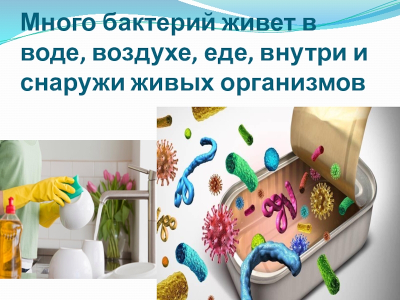 Слайд 3Много бактерий живет в воде, воздухе, еде, внутри и снаружи живых