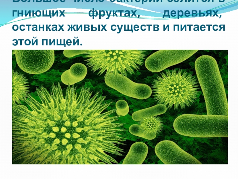 Слайд 5Большое число бактерий селится в гниющих фруктах, деревьях, останках живых существ