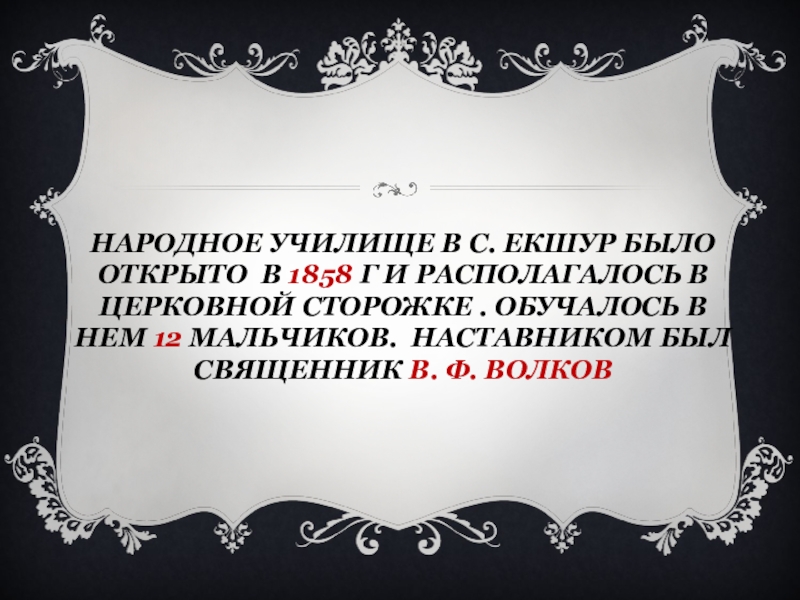 Слайд 2Народное училище в с. Екшур было открыто  в 1858 г и располагалось в церковной