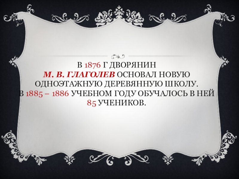 Слайд 8В 1876 Г дворянин  М. В. Глаголев основал новую одноэтажную деревянную школу.      В