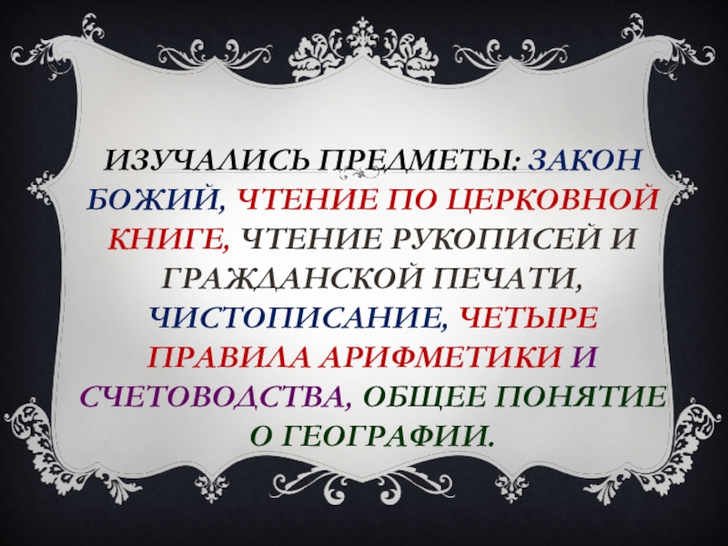 Слайд 3Изучались предметы: Закон Божий, чтение по церковной книге, чтение рукописей и
