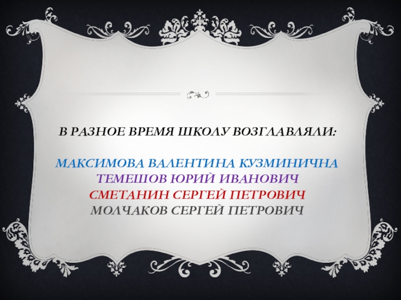 Слайд 20В разное время школу возглавляли: Максимова Валентина Кузминична Темешов Юрий Иванович Сметанин Сергей Петрович Молчаков