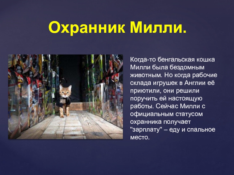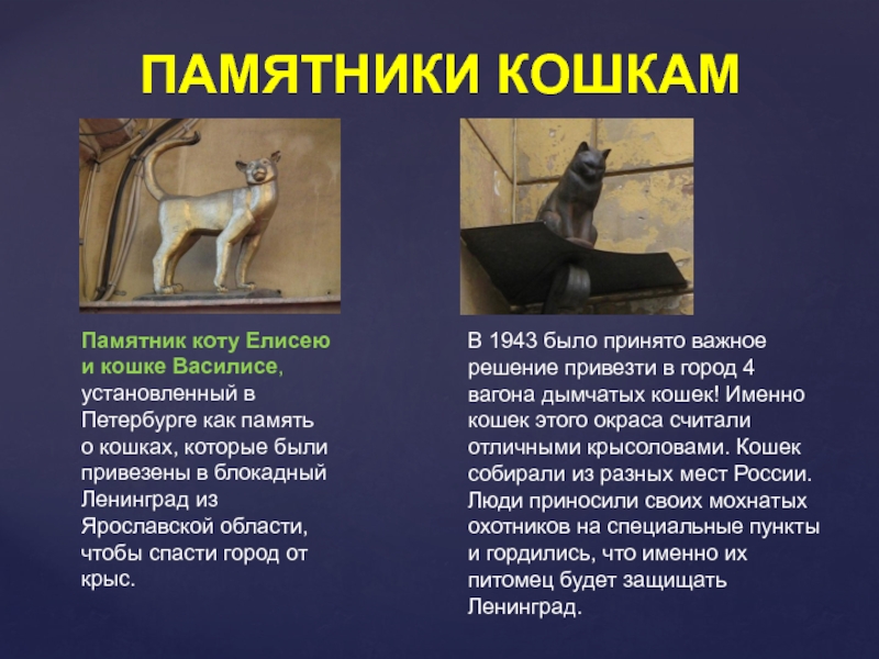 В 1943 было принято важное решение привезти в город 4 вагона дымчатых кошек! Именно кошек этого окраса считали отличными крысоловами. Кошек собирали из разных мест России. Люди приносили своих мохнатых охотников на специальные пункты и гордились, что именно их питомец будет защищать Ленинград.