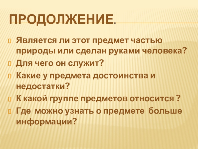 Продолжение.Является ли этот предмет частью природы или сделан руками человека?Для чего он служит?Какие у предмета достоинства и