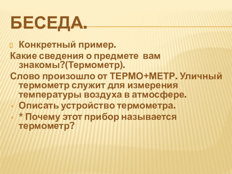 БЕСЕДА.Конкретный пример.Какие сведения о предмете вам знакомы?(Термометр).Слово произошло от ТЕРМО+МЕТР. Уличный термометр служит для измерения температуры воздуха