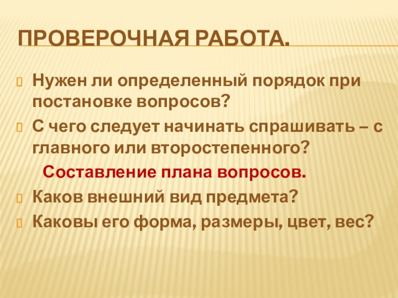 Проверочная работа.Нужен ли определенный порядок при постановке вопросов?С чего следует начинать спрашивать – с главного или второстепенного?