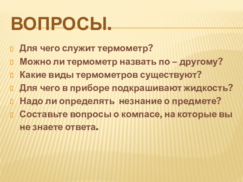 Вопросы.Для чего служит термометр?Можно ли термометр назвать по – другому?Какие виды термометров существуют?Для чего в приборе подкрашивают