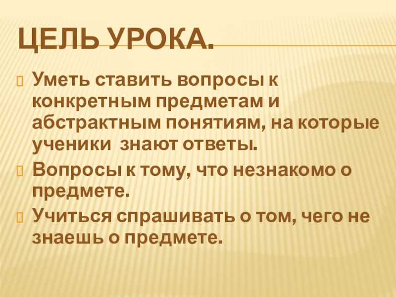 ЦЕЛЬ УРОКА.Уметь ставить вопросы к конкретным предметам и абстрактным понятиям, на которые ученики знают ответы.Вопросы к тому,