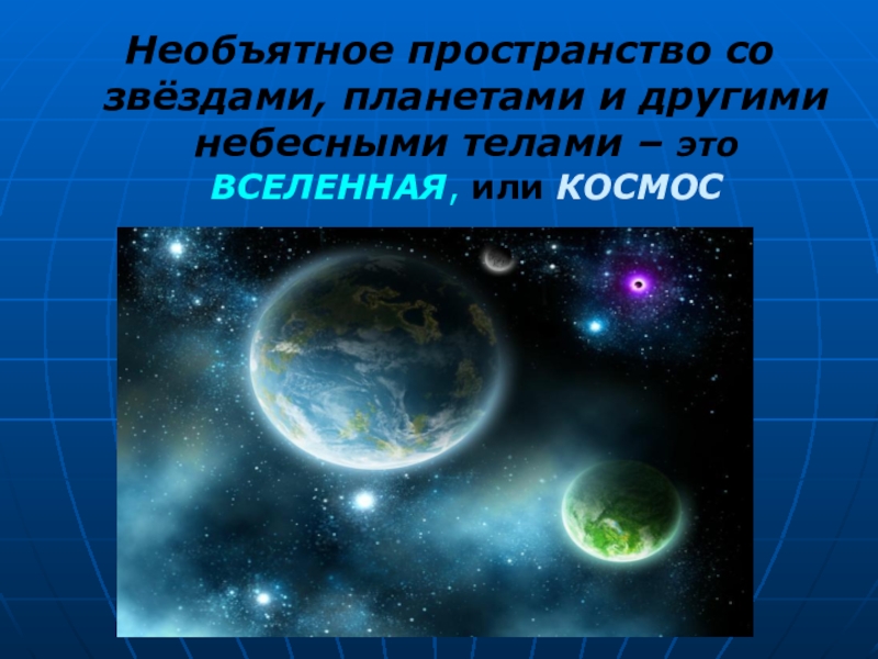 Необъятное пространство со звёздами, планетами и другими небесными телами – это ВСЕЛЕННАЯ, или КОСМОС