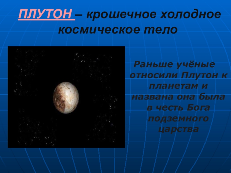 ПЛУТОН – крошечное холодное космическое телоРаньше учёные относили Плутон к планетам и названа она была в честь