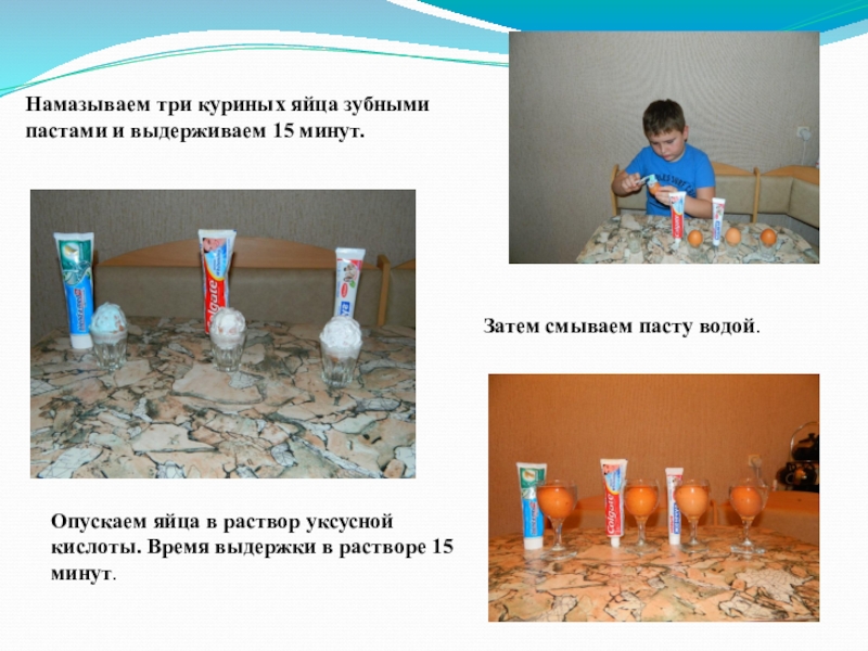 На скорлупе яиц, обработанных пастами «Новый жемчуг» и «Colgаte», появились множественные трещины, при небольшом сжатии в ладони яйца легко разбились.