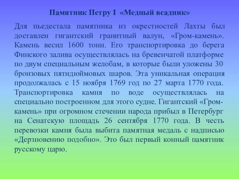 доставлен гигантский гранитный валун, «Гром-камень». Камень весил 1600 тонн. Его транспортировка до берега Финского залива осуществлялась на бревенчатой платформе по двум специальным желобам, в которые были уложены 30 бронзовых пятидюймовых шаров. Эта уникальная операция продолжалась с 15 ноября 1769 год по 27 марта 1770 года. Транспортировка камня по воде осуществлялась на специально построенном для этого судне. Гигантский «Гром-камень» при огромном стечении народа прибыл в Петербург на Cенатскую площадь 26 сентября 1770 года. В честь перевозки камня была выбита памятная медаль с надписью «Дерзновению подобно». Это был первый конный памятник русскому царю.