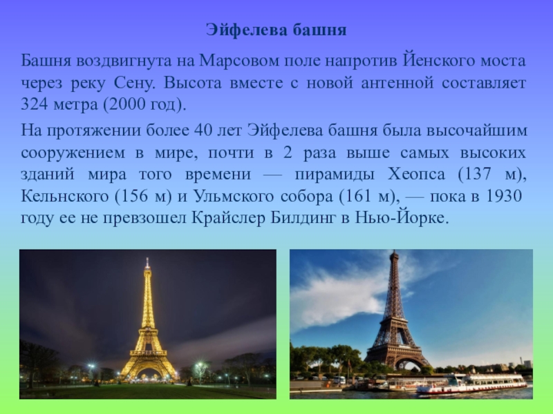 На протяжении более 40 лет Эйфелева башня была высочайшим сооружением в мире, почти в 2 раза выше самых высоких зданий мира того времени — пирамиды Хеопса (137 м), Кельнского (156 м) и Ульмского собора (161 м), — пока в 1930 году ее не превзошел Крайслер Билдинг в Нью-Йорке.