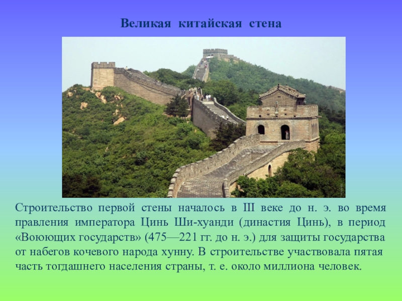 э. во время правления императора Цинь Ши-хуанди (династия Цинь), в период «Воюющих государств» (475—221 гг. до н. э.) для защиты государства от набегов кочевого народа хунну. В строительстве участвовала пятая часть тогдашнего населения страны, т. е. около миллиона человек.