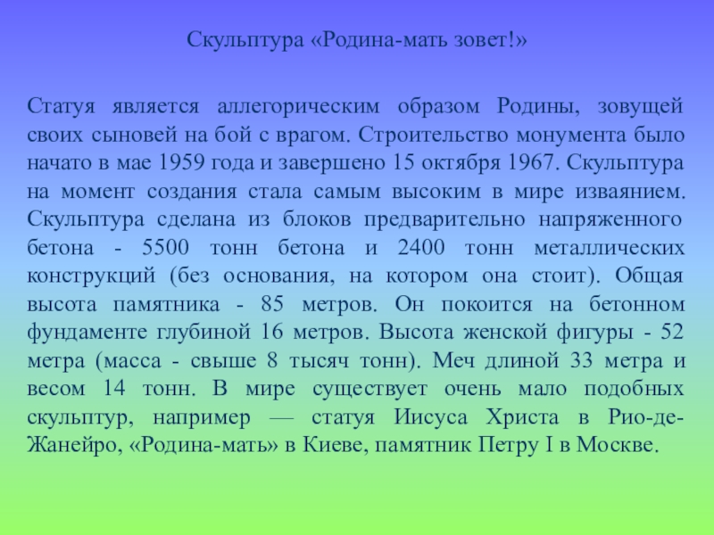 бой с врагом. Строительство монумента было начато в мае 1959 года и завершено 15 октября 1967. Скульптура на момент создания стала самым высоким в мире изваянием. Скульптура сделана из блоков предварительно напряженного бетона - 5500 тонн бетона и 2400 тонн металлических конструкций (без основания, на котором она стоит). Общая высота памятника - 85 метров. Он покоится на бетонном фундаменте глубиной 16 метров. Высота женской фигуры - 52 метра (масса - свыше 8 тысяч тонн). Меч длиной 33 метра и весом 14 тонн. В мире существует очень мало подобных скульптур, например — статуя Иисуса Христа в Рио-де-Жанейро, «Родина-мать» в Киеве, памятник Петру I в Москве.