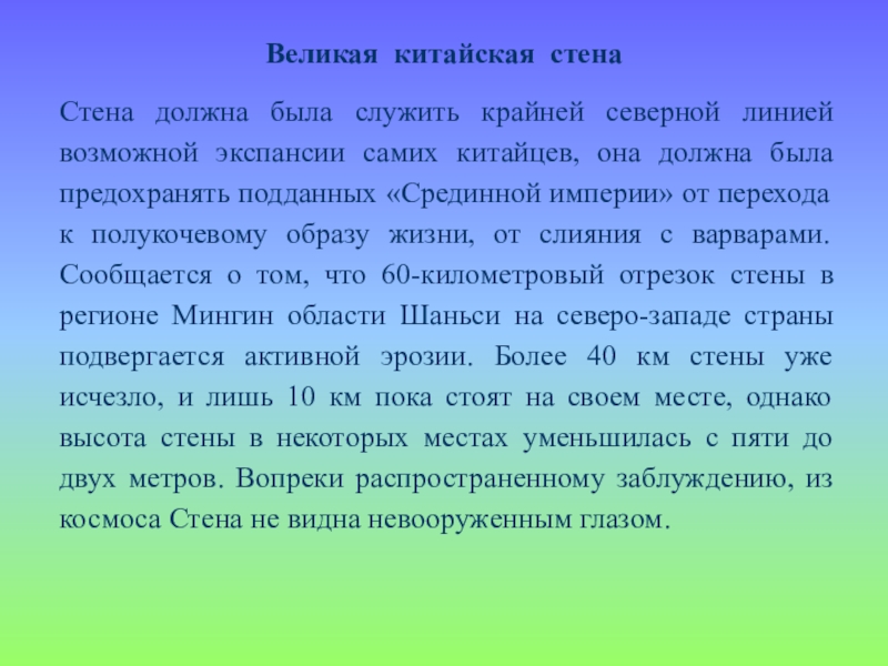 самих китайцев, она должна была предохранять подданных «Срединной империи» от перехода к полукочевому образу жизни, от слияния с варварами. Сообщается о том, что 60-километровый отрезок стены в регионе Мингин области Шаньси на северо-западе страны подвергается активной эрозии. Более 40 км стены уже исчезло, и лишь 10 км пока стоят на своем месте, однако высота стены в некоторых местах уменьшилась с пяти до двух метров. Вопреки распространенному заблуждению, из космоса Стена не видна невооруженным глазом.