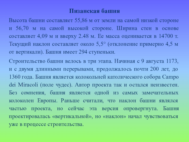 Санта-Мария Маджоре в городе Пиза. Башня получила прозвище «Падающая башня» и всемирную известность благодаря тому, что она сильно наклонена и как бы «падает».