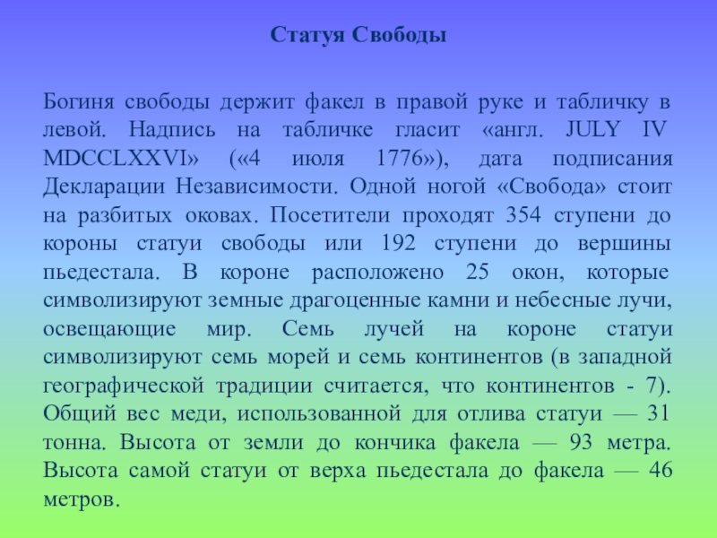 левой. Надпись на табличке гласит «англ. JULY IV MDCCLXXVI» («4 июля 1776»), дата подписания Декларации Независимости. Одной ногой «Свобода» стоит на разбитых оковах. Посетители проходят 354 ступени до короны статуи свободы или 192 ступени до вершины пьедестала. В короне расположено 25 окон, которые символизируют земные драгоценные камни и небесные лучи, освещающие мир. Семь лучей на короне статуи символизируют семь морей и семь континентов (в западной географической традиции считается, что континентов - 7). Общий вес меди, использованной для отлива статуи — 31 тонна. Высота от земли до кончика факела — 93 метра. Высота самой статуи от верха пьедестала до факела — 46 метров.