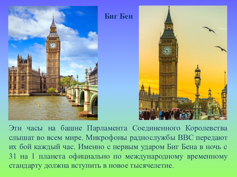 мире. Микрофоны радиослужбы ВВС передают их бой каждый час. Именно с первым ударом Биг Бена в ночь с 31 на 1 планета официально по международному временному стандарту должна вступить в новое тысячелетие.