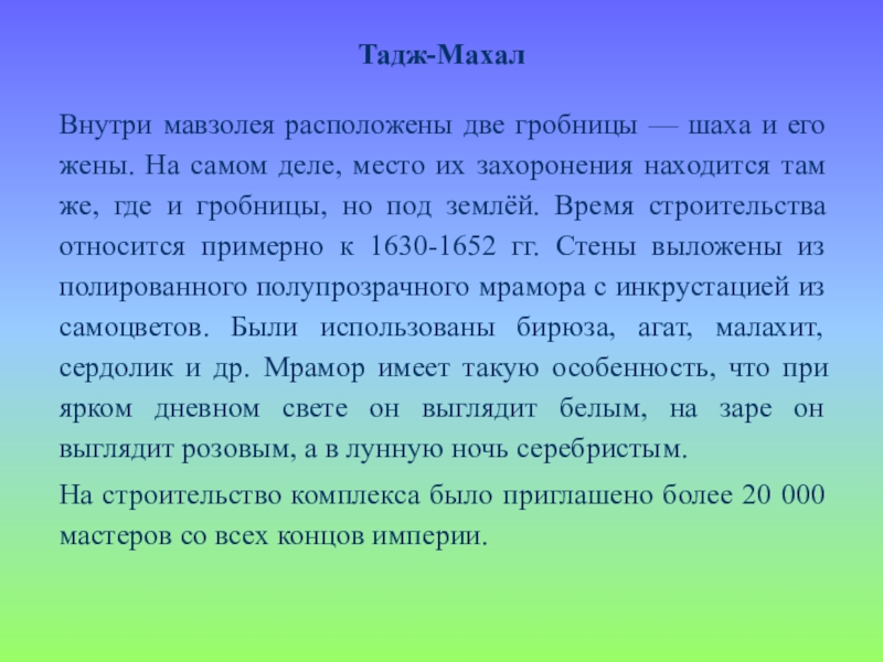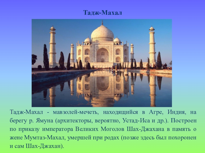 (архитекторы, вероятно, Устад-Иса и др.). Построен по приказу императора Великих Моголов Шах-Джахана в память о жене Мумтаз-Махал, умершей при родах (позже здесь был похоронен и сам Шах-Джахан).