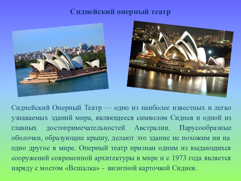 легко узнаваемых зданий мира, являющееся символом Сиднея и одной из главных достопримечательностей Австралии. Парусообразные оболочки, образующие крышу, делают это здание не похожим ни на одно другое в мире. Оперный театр признан одним из выдающихся сооружений современной архитектуры в мире и с 1973 года является наряду с мостом «Вешалка» - визитной карточкой Сиднея.
