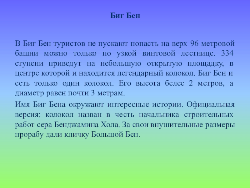 метровой башни можно только по узкой винтовой лестнице. 334 ступени приведут на небольшую открытую площадку, в центре которой и находится легендарный колокол. Биг Бен и есть только один колокол. Его высота белее 2 метров, а диаметр равен почти 3 метрам.