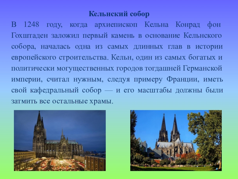 первый камень в основание Кельнского собора, началась одна из самых длинных глав в истории европейского строительства. Кельн, один из самых богатых и политически могущественных городов тогдашней Германской империи, считал нужным, следуя примеру Франции, иметь свой кафедральный собор — и его масштабы должны были затмить все остальные храмы.