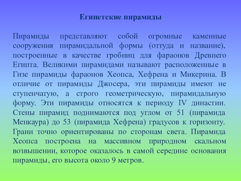 название), построенные в качестве гробниц для фараонов Древнего Египта. Великими пирамидами называют расположенные в Гизе пирамиды фараонов Хеопса, Хефрена и Микерина. В отличие от пирамиды Джосера, эти пирамиды имеют не ступенчатую, а строго геометрическую, пирамидальную форму. Эти пирамиды относятся к периоду IV династии. Стены пирамид поднимаются под углом от 51 (пирамида Менкаура) до 53 (пирамида Хефрена) градусов к горизонту. Грани точно ориентированы по сторонам света. Пирамида Хеопса построена на массивном природном скальном возвышении, которое оказалось в самой середине основания пирамиды, его высота около 9 метров.