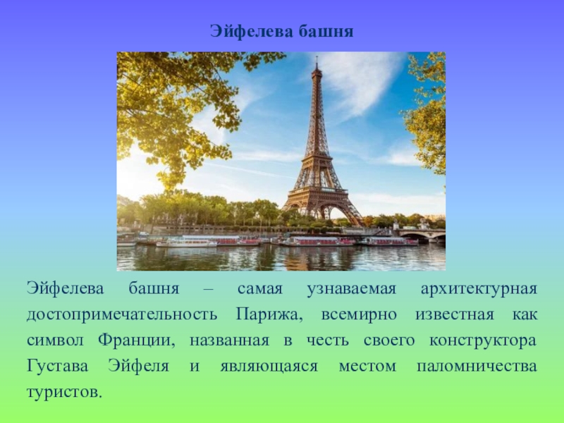 как символ Франции, названная в честь своего конструктора Густава Эйфеля и являющаяся местом паломничества туристов.