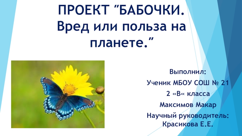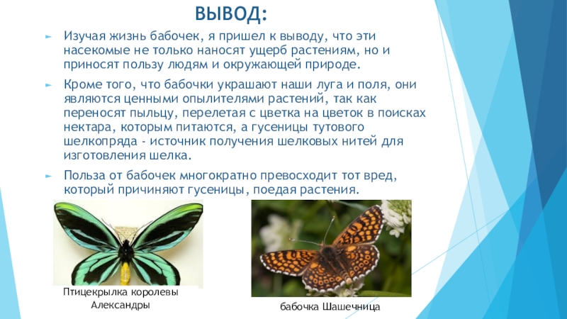 Бабочки и гусеницы кормятся на растениях, и их самих поедают разнообразные хищники. Значит, бабочки — входят в состав пищевых цепочек. Особенно велика роль бабочек как опылителей растений. Ведь их основная пища — нектар, и когда они собирают его, то переносят пыльцу с цветка на цветок. Если бы растения не опылялись, то со временем они просто исчезли с земли. Например , личинка бабочки – ТУТОВЫЙ ШЕЛКОПРЯД дает людям шелковую нить. Однако шёлк не единственный дар тутового шелкопряда людям: из его куколок сравнительно недавно начали выделять масло, используемое как лекарство.