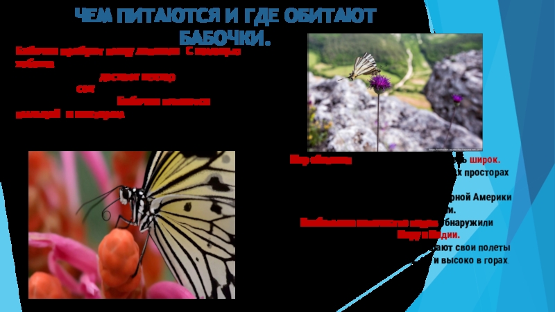 Бабочки пробуют пищу лапками. С помощью хоботка, который раскручивается как трубка, бабочки достают нектар из цветков или высасывают сок, вытекающий из поврежденных -деревьев и плодов. Бабочки питаются пыльцой и нектаром цветущих растений. Многие виды бабочек питаются соками деревьев, перезревшими фруктами.