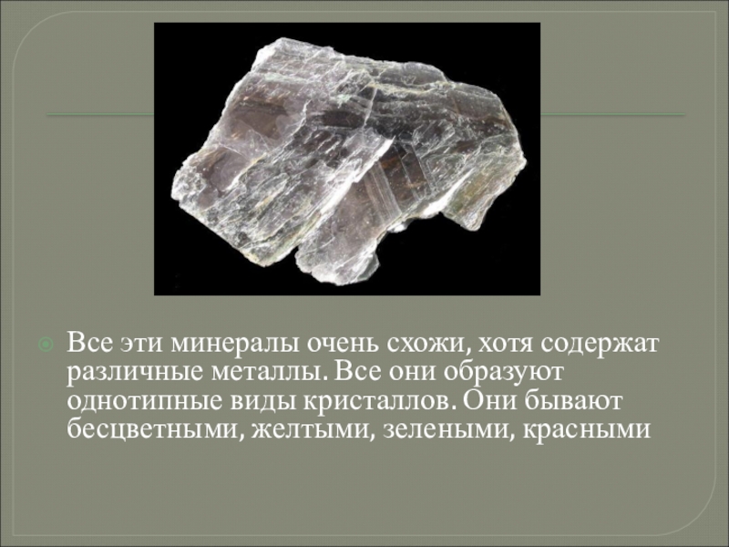 Все эти минералы очень схожи, хотя содержат различные металлы. Все они