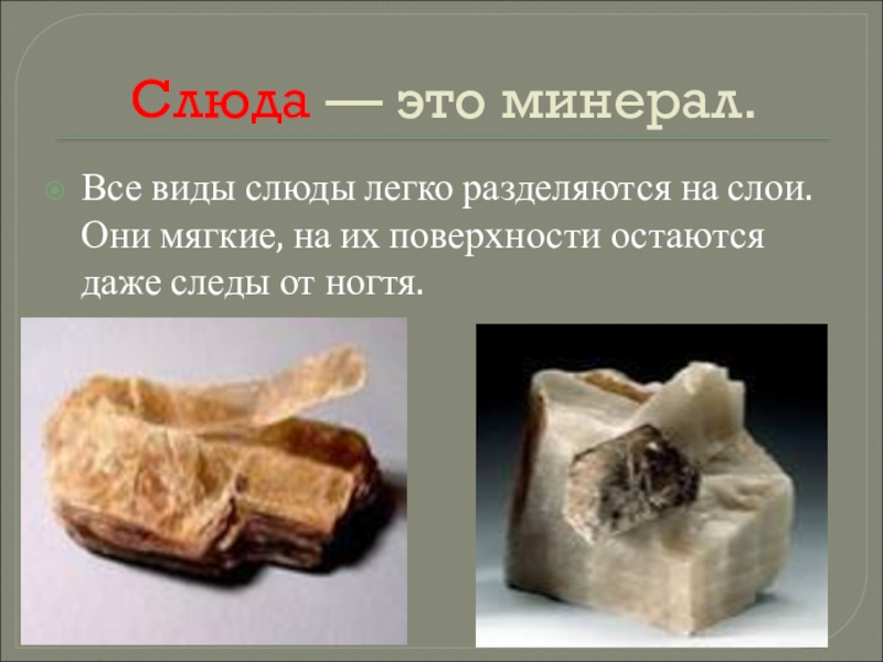 Слюда — это минерал.Все виды слюды легко разделяются на слои. Они мягкие, на их поверхности остаются даже