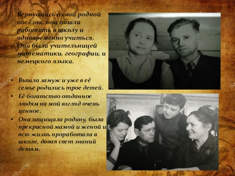 Вернувшись в свой родной посёлок, она пошла работать в школу и одновременно учиться. Она была учительницей математики, географии, и немецкого языка.