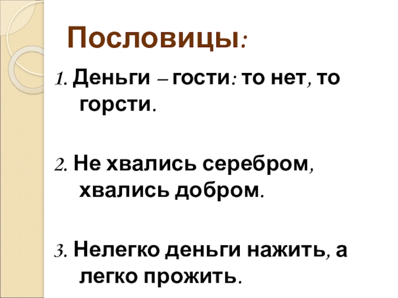 Пословицы:1. Деньги – гости: то нет, то горсти.2. Не хвались серебром, хвались добром.3. Нелегко деньги нажить, а
