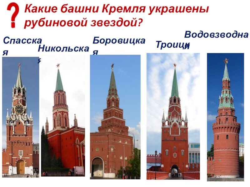 Слайд 16Какие башни Кремля украшены рубиновой звездой?