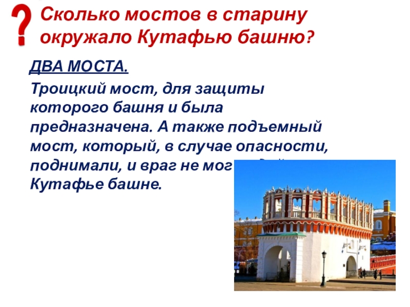 Слайд 86Сколько мостов в старину окружало Кутафью башню?