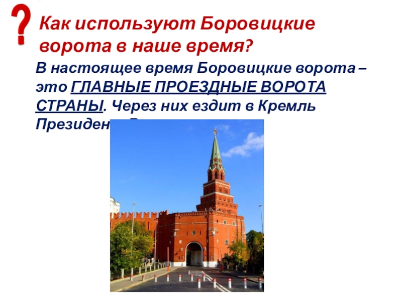 Слайд 73Как используют Боровицкие ворота в наше время?