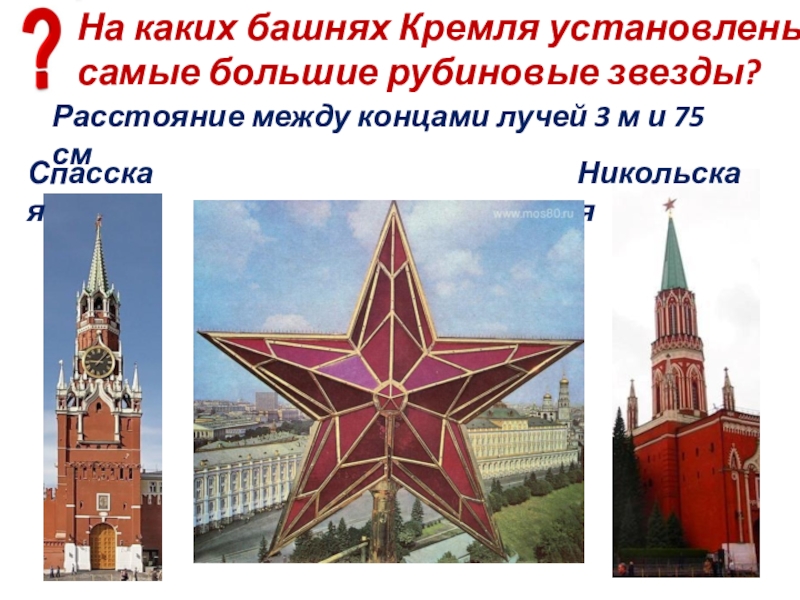 Слайд 17На каких башнях Кремля установлены самые большие рубиновые звезды?