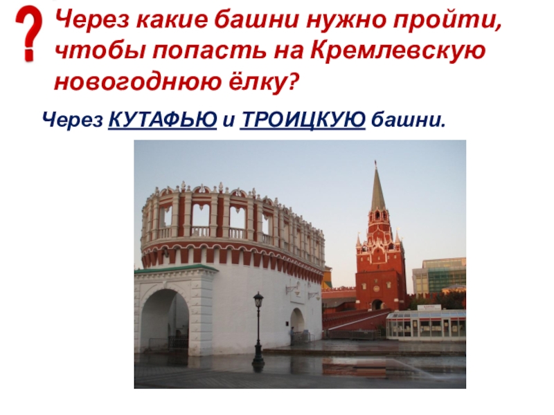 Слайд 9Через какие башни нужно пройти, чтобы попасть на Кремлевскую новогоднюю ёлку?
