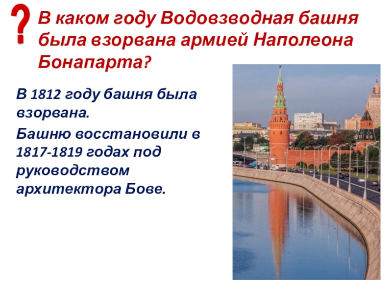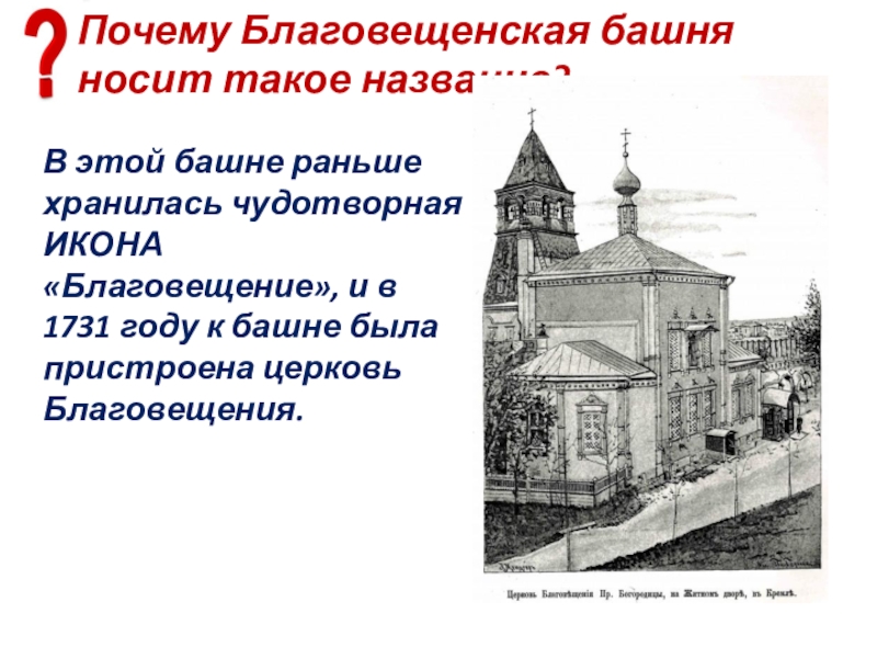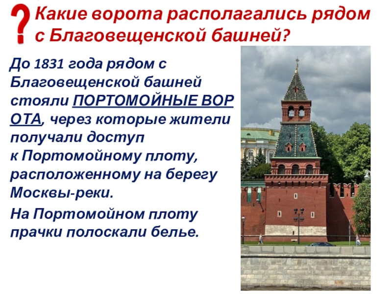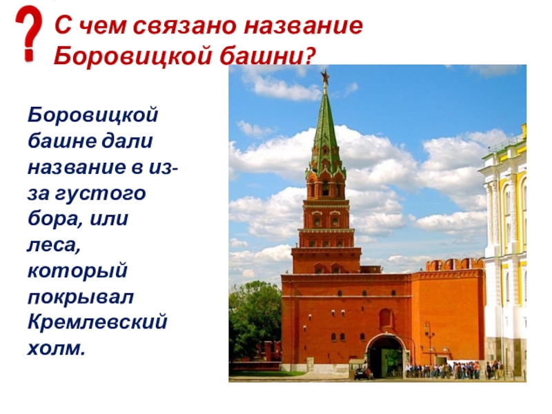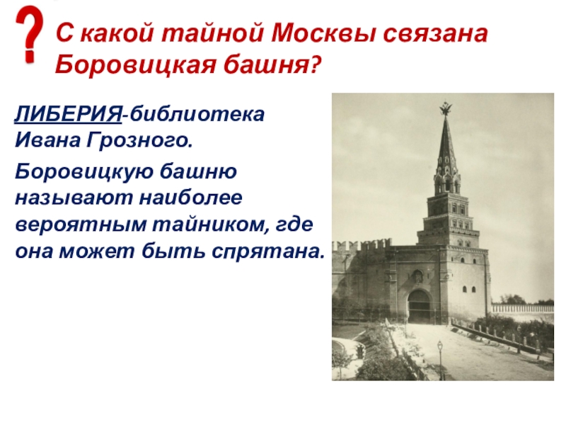 Слайд 72С какой тайной Москвы связана Боровицкая башня?