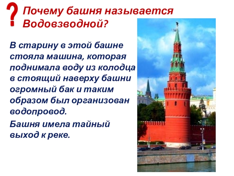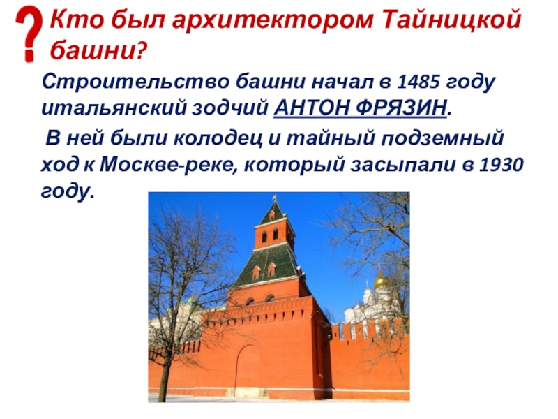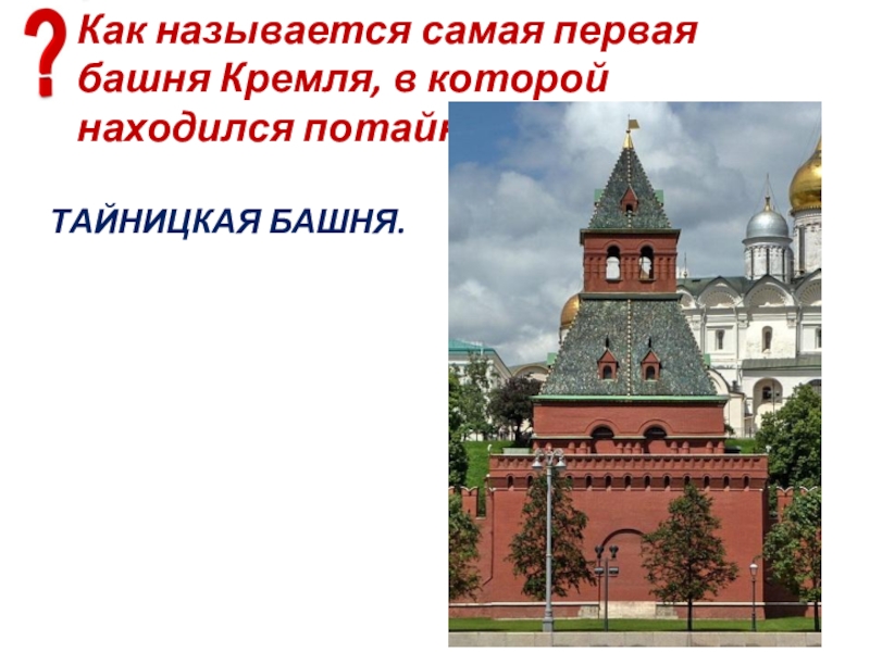 Слайд 93В какой башне Кремля был найден потайной колодец и выход к